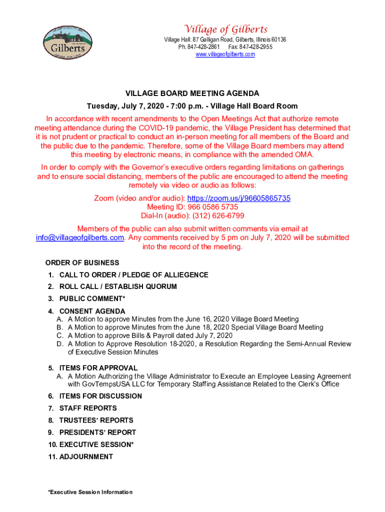 Village of GilbertsVillage Hall: 87 Gilligan Road, Gilbert's, Illinois 60136 pH. 8474282861 Fax: 8474282955 www.villageofgilberts.comVILLAGE BOARD MEETING AGENDA Tuesday, July 7, 2020 7:00 p.m. Village