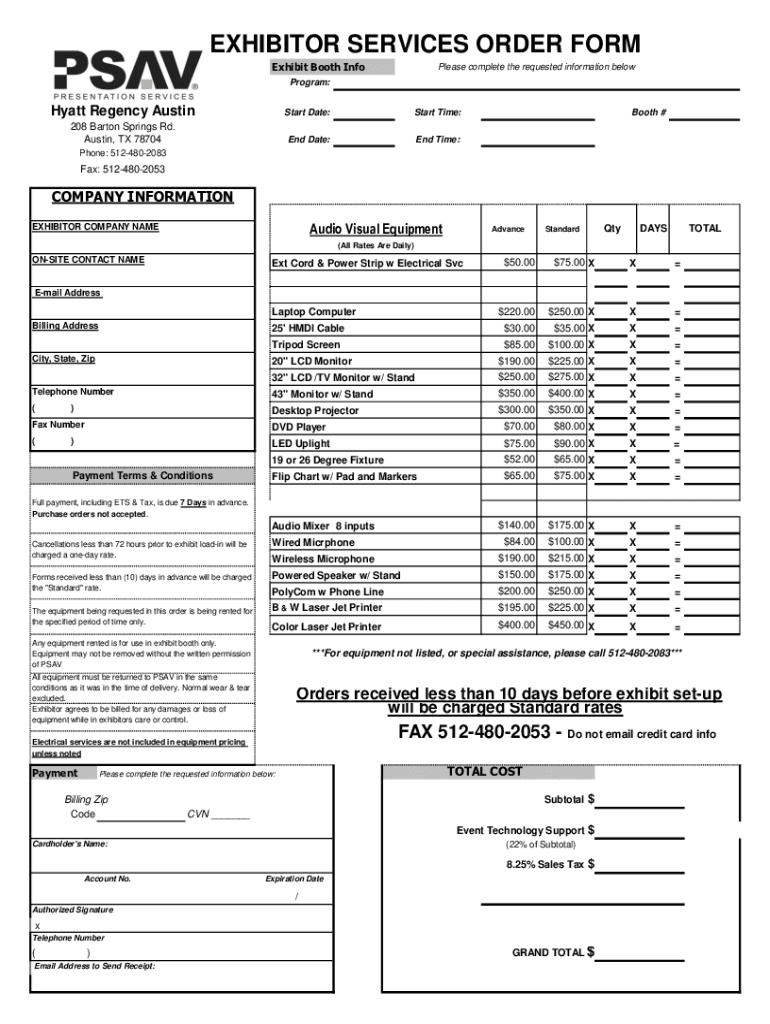 EXHIBITOR SERVICES ORDER FORM Exhibit Booth InfoPlease complete the requested information belowProgram:Hyatt Regency Autostart Date:Start Time:208 Barton Springs Rd. Austin, TX 78704End Date:End Time:Booth