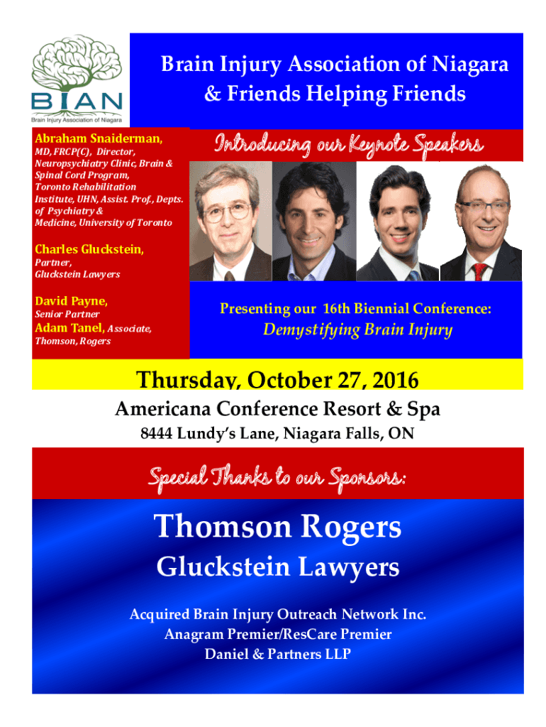 Brain Injury Association of Niagara & Friends Helping Friends Abraham Alderman, MD, FRC(C), Director, Neuropsychiatric Clinic, Brain & Spinal Cord Program, Toronto Rehabilitation Institute, UHF, Assist.