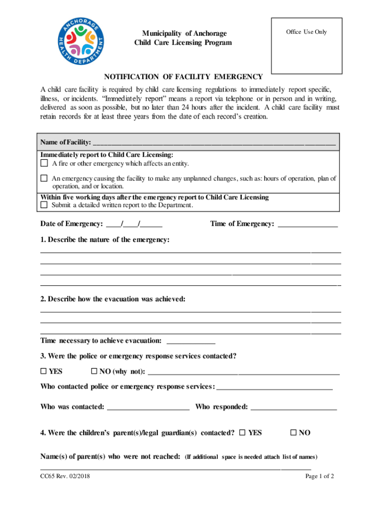 Office Use OnlyMunicipality of Anchorage Child Care Licensing ProgramNOTIFICATION OF FACILITY EMERGENCY A child care facility is required by child care licensing regulations to immediately report