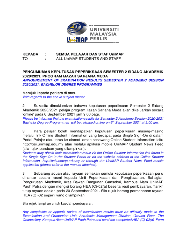 ALL UNIMA STUDENTS AND STAFFPENGUMUMAN KEPUTUSAN PEPERIKSAAN SEMESTER 2 SIDING ACADEMIC
