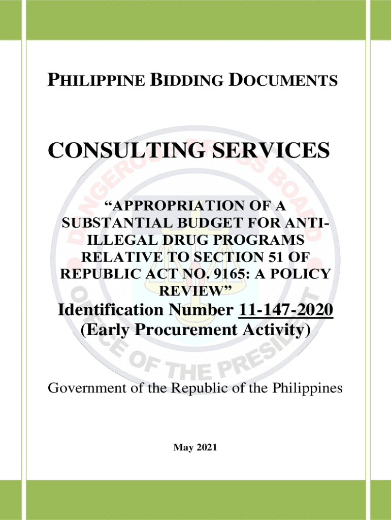 PHILIPPINE BIDDING DOCUMENTSCONSULTING SERVICES APPROPRIATION OF A SUBSTANTIAL BUDGET FOR ANTILLEAN DRUG PROGRAMS RELATIVE TO SECTION 51 OF REPUBLIC ACT NO. 9165: A POLICY REVIEWIdentification Number