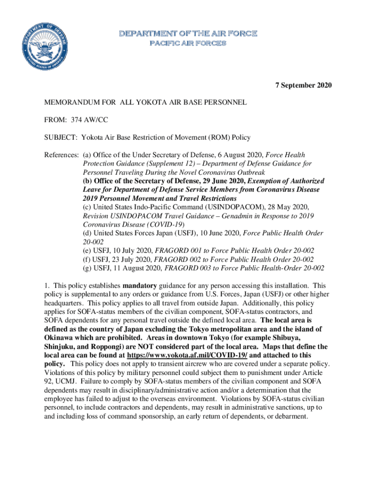 DEPARTMENT OF THE AIR FORCE PACIFIC AIR FORCES7 September 2020 MEMORANDUM FOR ALL DAKOTA AIR BASE PERSONNEL FROM: 374 AW/CC SUBJECT: Yoko ta Air Base Restriction of Movement (ROM) Policy References: