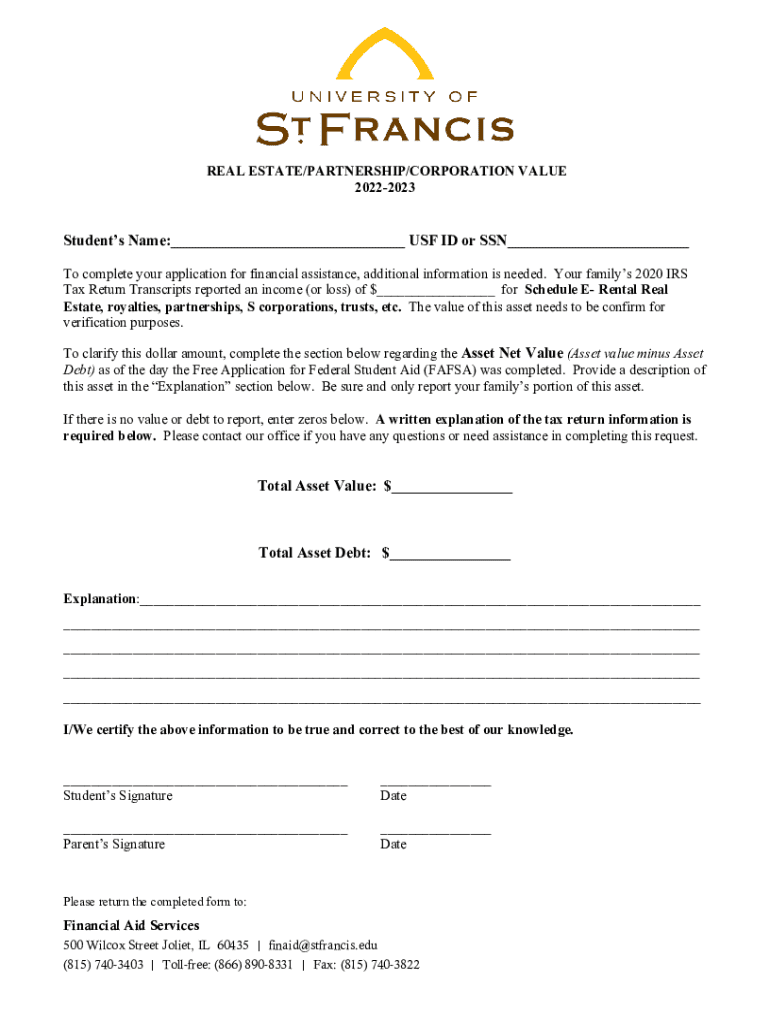 REAL ESTATE/PARTNERSHIP/CORPORATION VALUE 20222023Students Name:___ USF ID or SSN___ To complete your application for financial assistance, additional information is needed. Your families 2020 IRS