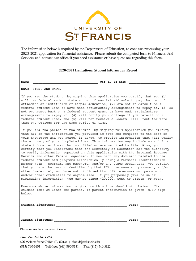 The information below is required by the Department of Education, to continue processing your 20202021 application for financial assistance. Please submit the completed form to Financial Aid Services