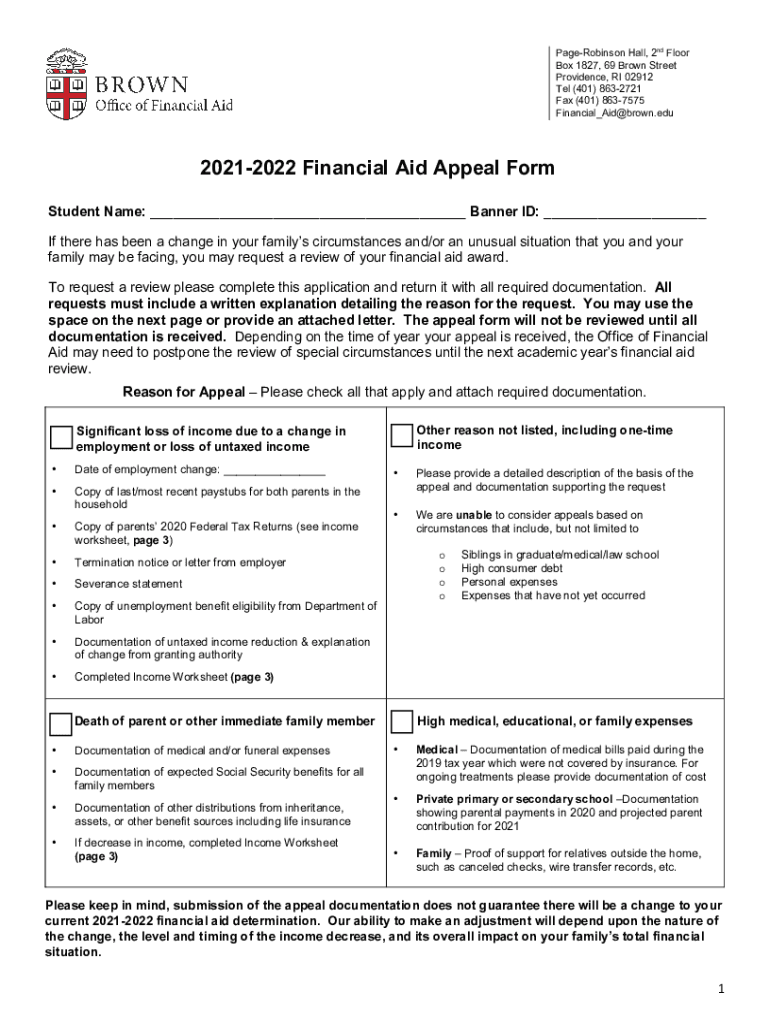Page Robinson Hall, 2nd Floor Box 1827, 69 Brown Street Providence, RI 02912 Tel (401) 8632721 Fax (401) 8637575 Financial_Aid@brown.edu20212022 Financial Aid Appeal Form Student Name: ___ Banner