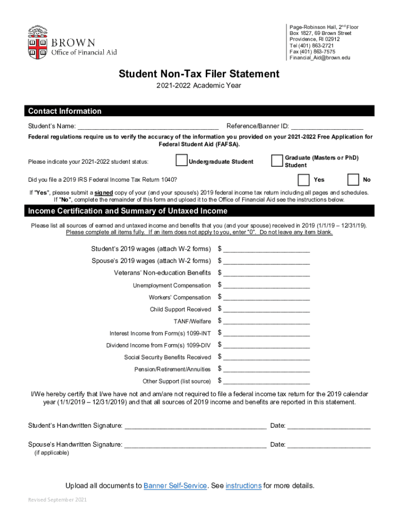 Page Robinson Hall, 2nd Floor Box 1827, 69 Brown Street Providence, RI 02912 Tel (401) 8632721 Fax (401) 8637575 Financial_Aid@brown.eduStudent Syntax Filer Statement 20212022 Academic Recontact Information