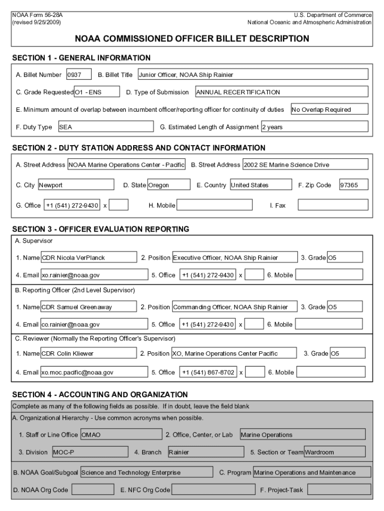 NOAA Form 5628A (revised 9/25/2009)U.S. Department of Commerce National Oceanic and Atmospheric Administration NOAA COMMISSIONED OFFICER BILLET DESCRIPTION SECTION 1 GENERAL INFORMATION A. Billet