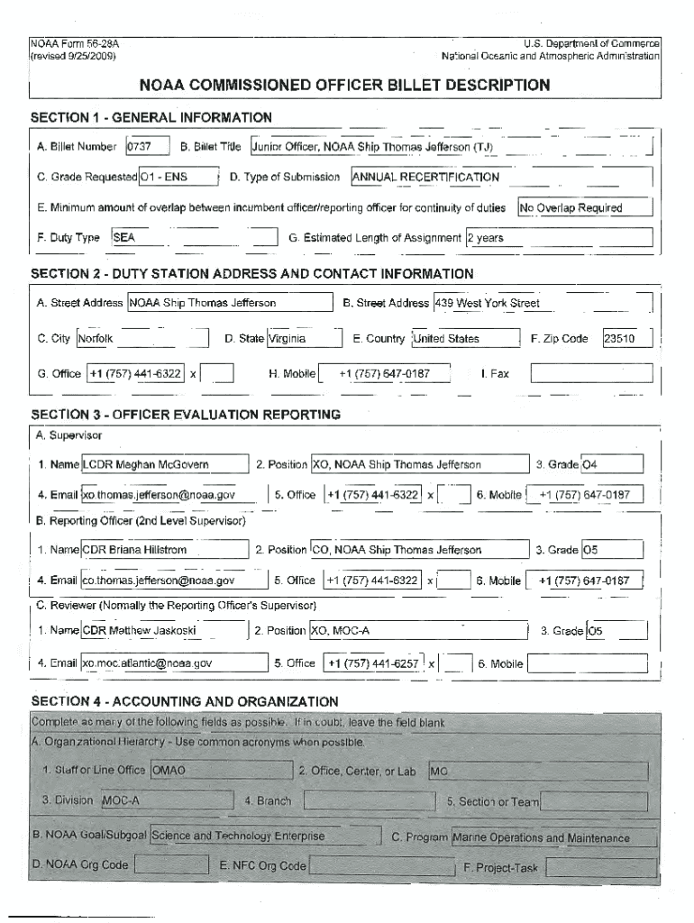 U.S. Department of Commerce National Oceanic and Atmospheric Administration NOAA Form 5628A (revised 9/25/2009)NOAA COMMISSIONED OFFICER BILLET DESCRIPTION SECTION 1 GENERAL INFORMATION A. Billet