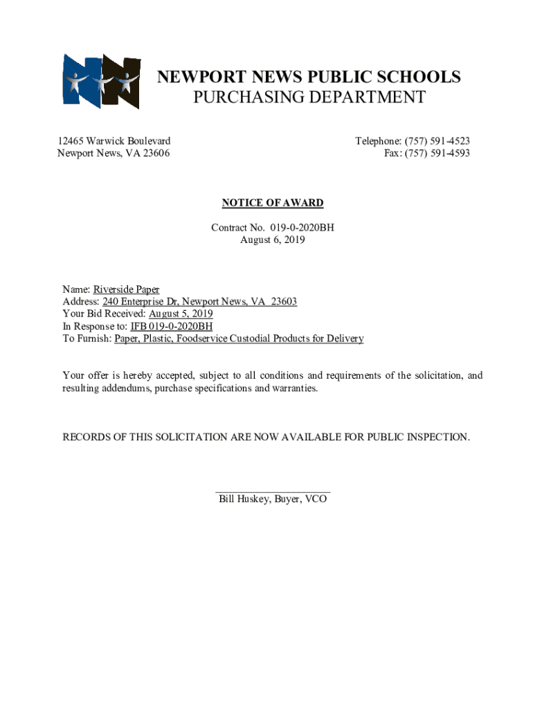 NEWPORT NEWS PUBLIC SCHOOLS PURCHASING DEPARTMENT 12465 Warwick Boulevard Newport News, VA 23606Telephone: (757) 5914523 Fax: (757) 5914593NOTICE OF AWARD Contract No. 01902020BH August 6, 2019Name: