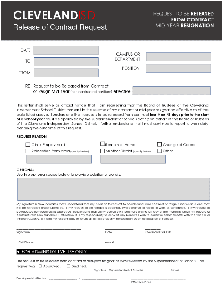 CLEVELANDISDREQUEST TO BE RELEASED FROM CONTRACT MIDYEAR RESIGNATIONRelease of Contract Request DECAMPS OR DEPARTMENTTOPOSITIONFROMRE Request to be Released from Contract or Resign Midyear (noncontracted