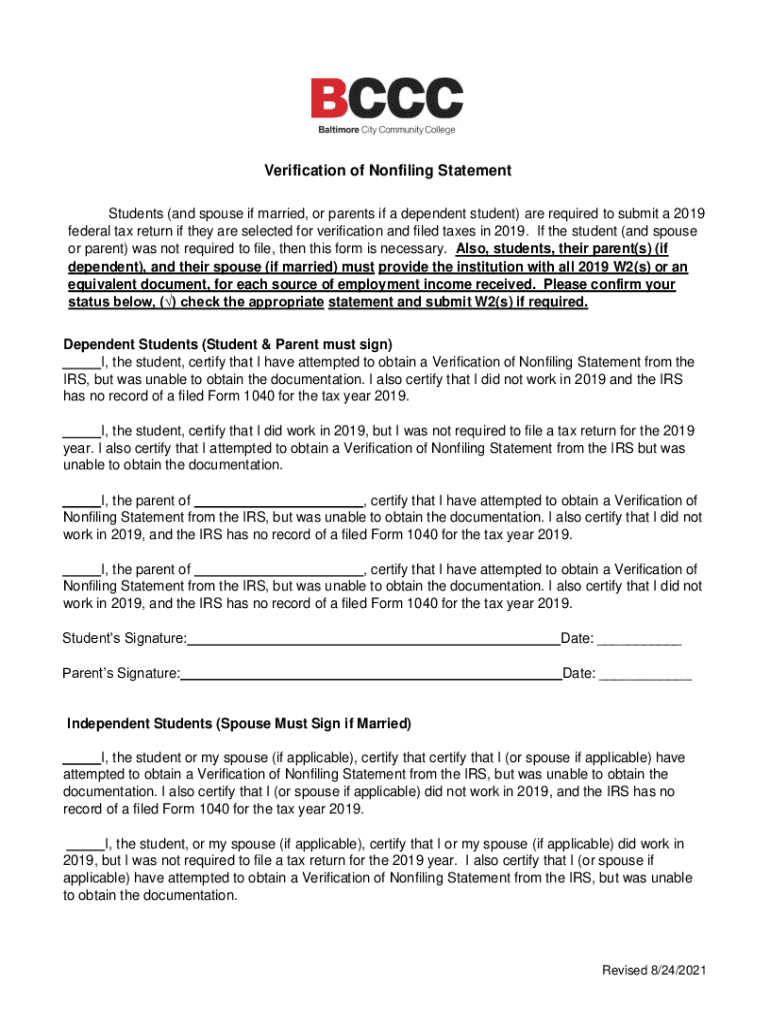 Verification of Nonfiling Statement Students (and spouse if married, or parents if a dependent student) are required to submit a 2019 federal tax return if they are selected for verification and filed