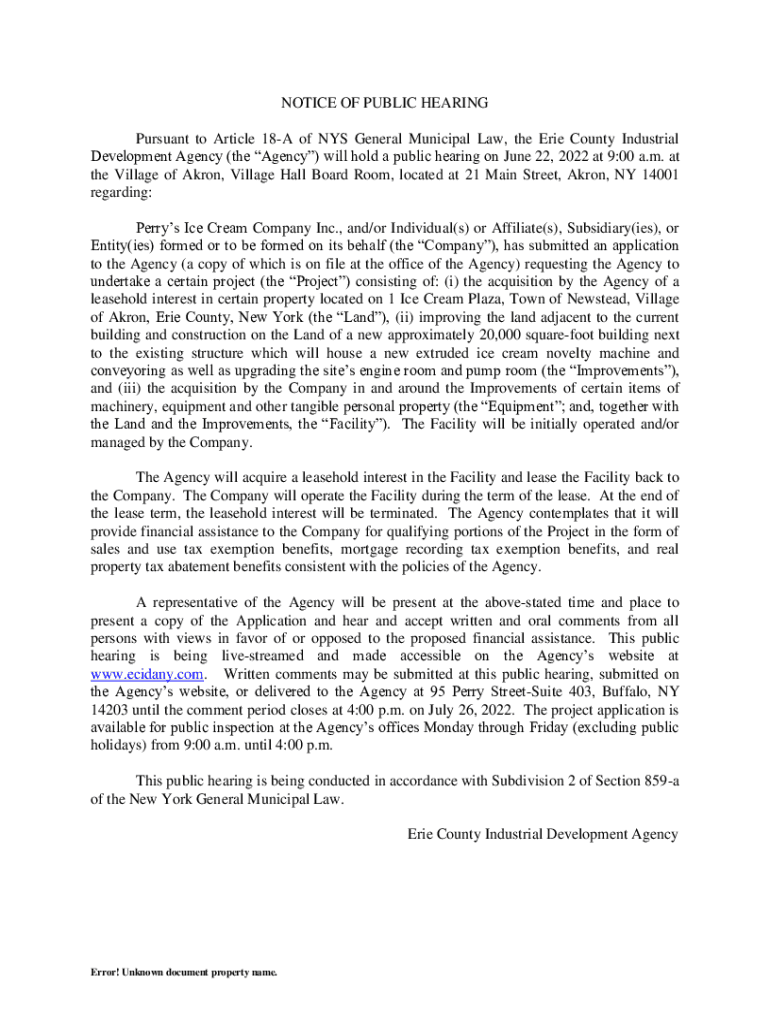 NOTICE OF PUBLIC HEARING Pursuant to Article 18A of NYS General Municipal Law, the Erie County Industrial Development Agency (the Agency) will hold a public hearing on June 22, 2022, at 9:00 a.m.