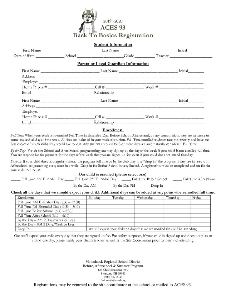 20192020ACES 93 Back To Basics Registration Student Information First Name ___ Last Name ___ Initial___ Date of Birth ___ School ___Grade ___ Teacher ___Parent or Legal Guardian Information First