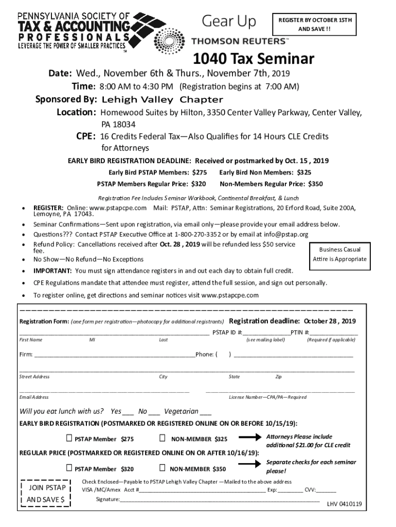 REGISTER BY OCTOBER 15TH AND SAVE !! Level: Intermediate IRS Sponsor/Course #E3S5R; E3S5R1040 Tax Seminar Date: Wed., November 6th & Thurs., November 7th, 2019 Time: 8:00 AM to 4:30 PM (Registration