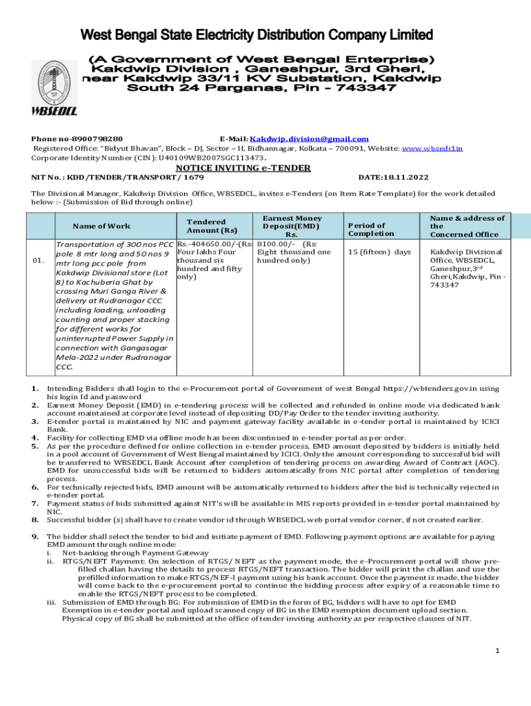 Phone no8900798280 Email: Kakdwip.division@gmail.com Registered Office: Bidet Haven, Block DJ, Sector II, Bhatnagar, Kolkata 700091, Website: www.wbsedcl.in Corporate Identity Number (IN): U40109WB2007SGC113473.NOTICE