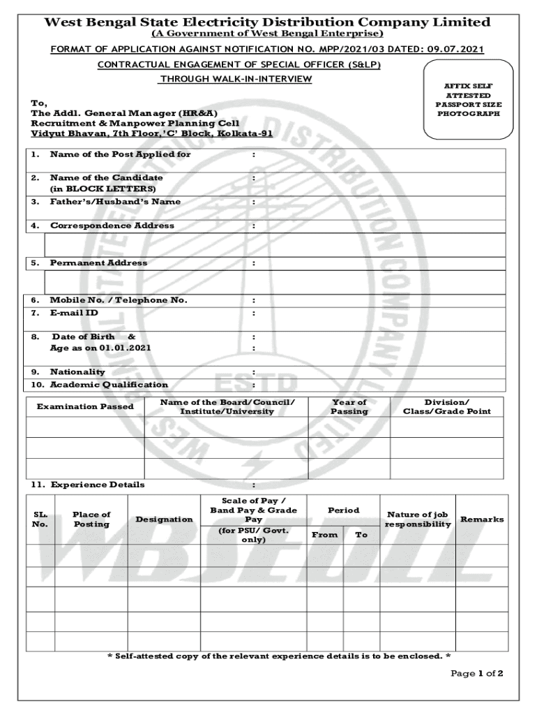 West Bengal State Electricity Distribution Company Limited (A Government of West Bengal Enterprise) FORMAT OF APPLICATION AGAINST NOTIFICATION NO. MPP/2021/03 DATED: 09.07.2021 CONTRACTUAL ENGAGEMENT