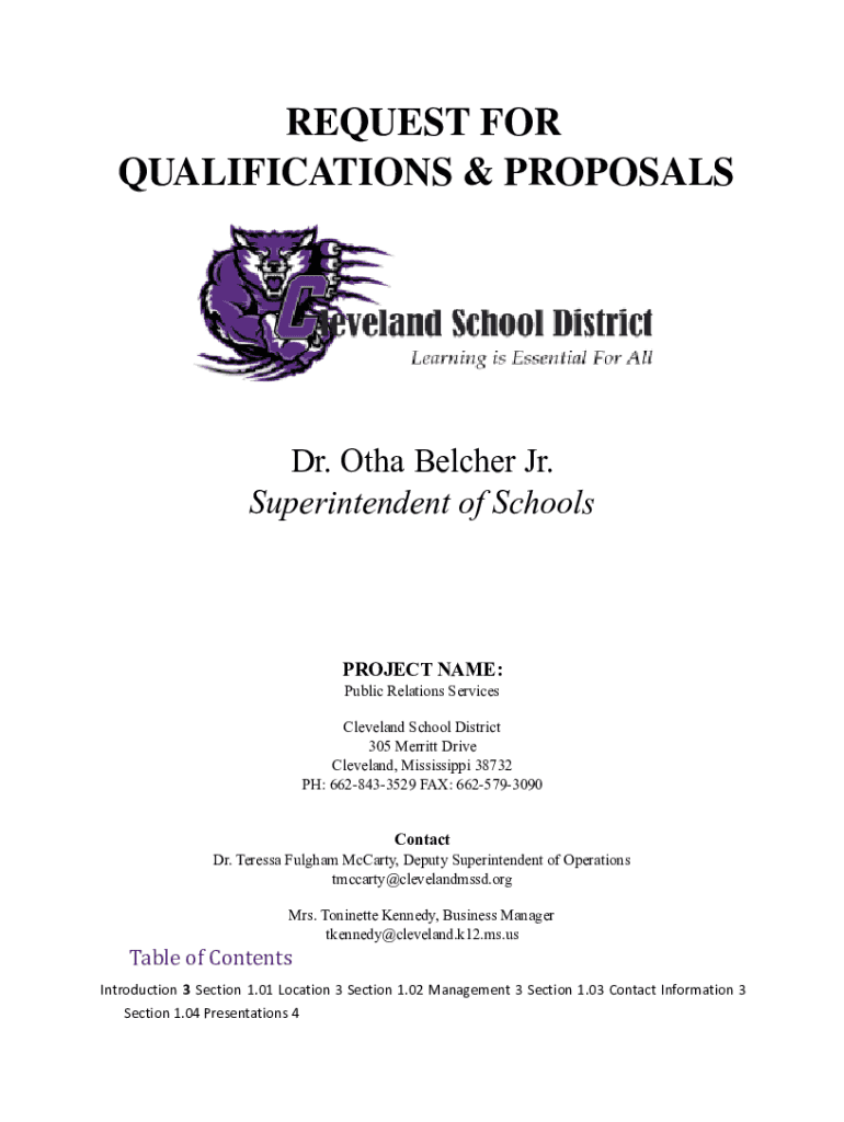 REQUEST FOR QUALIFICATIONS & PROPOSALS Dr. Botha Belcher Jr. Superintendent of SchoolsPROJECT NAME: Public Relations Services Cleveland School District 305 Merritt Drive Cleveland, Mississippi 38732