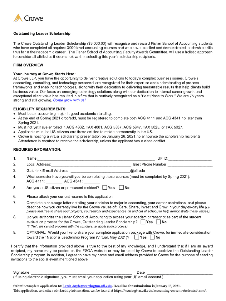 Outstanding Leader Scholarship The Crowe Outstanding Leader Scholarship ($3,000.00) will recognize and reward Fisher School of Accounting students who have completed all required 3000 level accounting