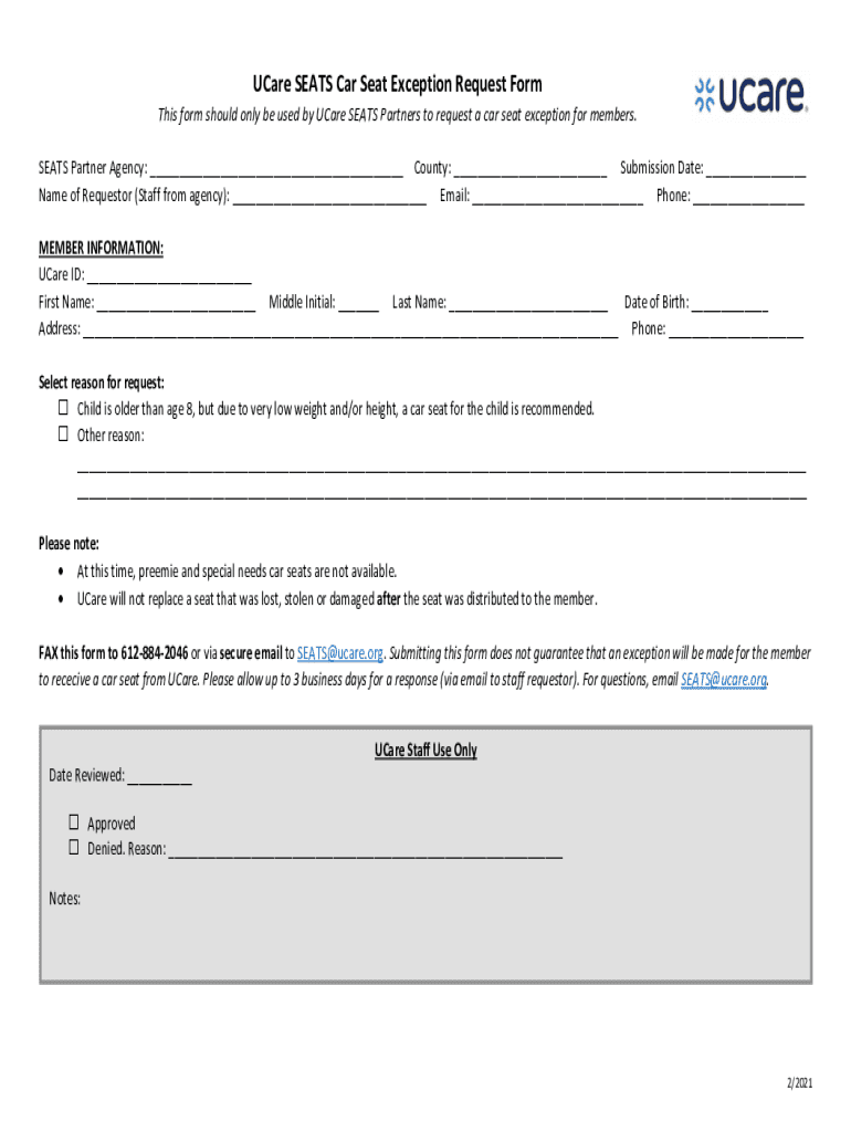 Care SEATS Car Seat Exception Request Form This form should only be used by Care SEATS Partners to request a car seat exception for members. SEATS Partner Agency: ___ County: ___ Submission Date: