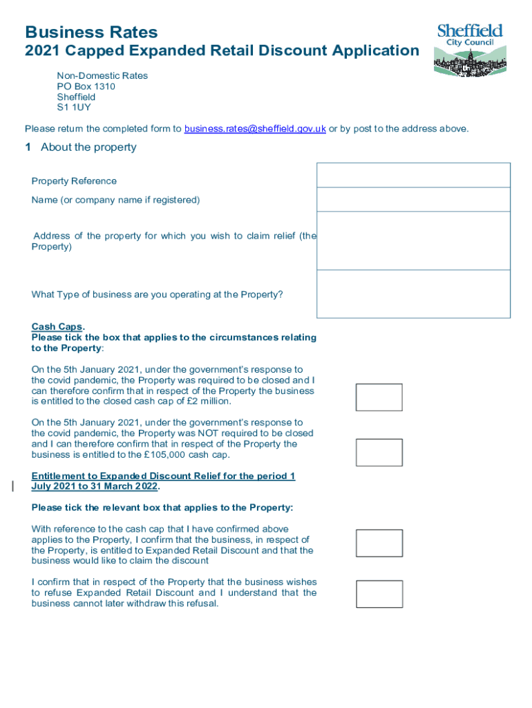 Business Rates 2021 Capped Expanded Retail Discount Application Domestic Rates PO Box 1310 Sheffield S1 1UY Please return the completed form to business.rates@sheffield.gov.uk or by post to the address