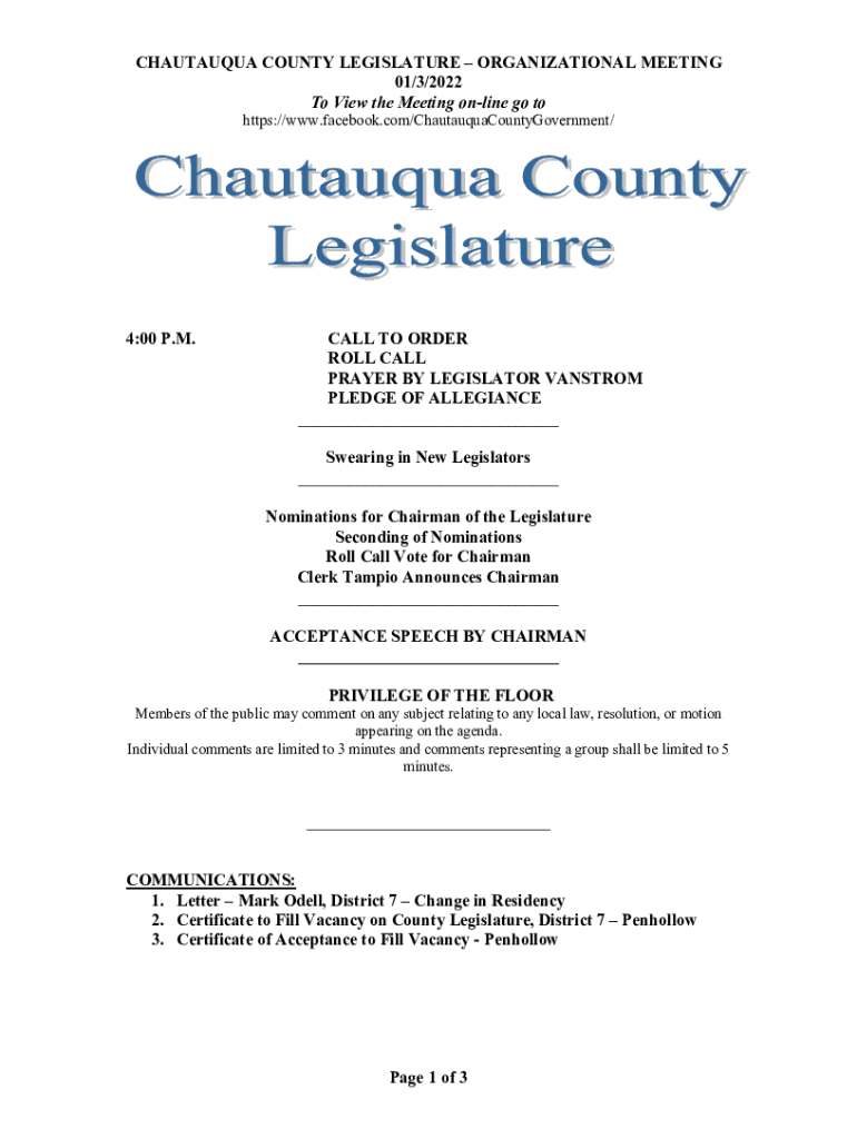 CHAUTAUQUA COUNTY LEGISLATURE ORGANIZATIONAL MEETING 01/3/2022 To View the Meeting online go to https://www.facebook.com/ChautauquaCountyGovernment/4:00 P.M.CALL TO ORDER ROLL CALL PRAYER BY LEGISLATOR
