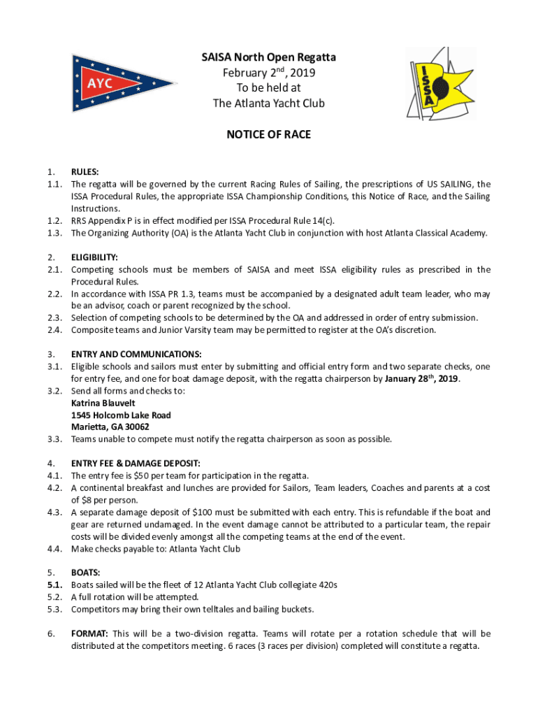 SALSA North Open Regatta February 2nd, 2019 To be held at The Atlanta Yacht Club NOTICE OF RACE 1. RULES: 1.1. The regatta will be governed by the current Racing Rules of Sailing, the prescriptions