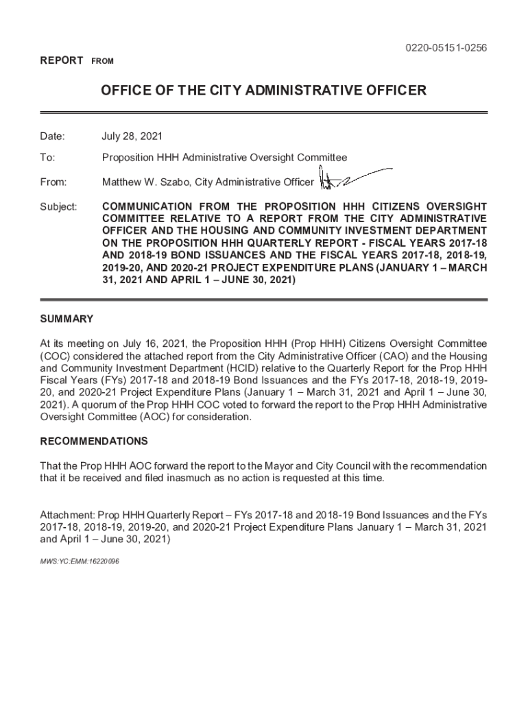 0220051510256 REPORTFROMOFFICE OF THE CITY ADMINISTRATIVE OFFICER Date:July 28, 2021To:Proposition HHH Administrative Oversight CommitteeFrom:Matthew W. Slab, City Administrative OfficerSubject:COMMUNICATION