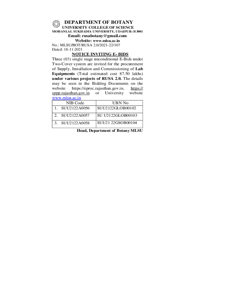 DEPARTMENT OF BOTANY UNIVERSITY COLLEGE OF SCIENCE MANUAL SHARIA UNIVERSITY, UDAIPUR313001Email: rusabotany@gmail.com Website: www.mlsu.ac.in No.: MSU/BOT/RUSH 2.0/202122/107 Dated: 18112021NOTICE