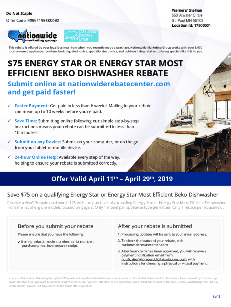 Warner's\' Stellar 550 At water Circle St. Paul MN 55103 Location I'd: 17800001Do Not Staple Or Code: NMG0419BEKOD02This rebate is offered by your local business from whom you recently made a purchase.