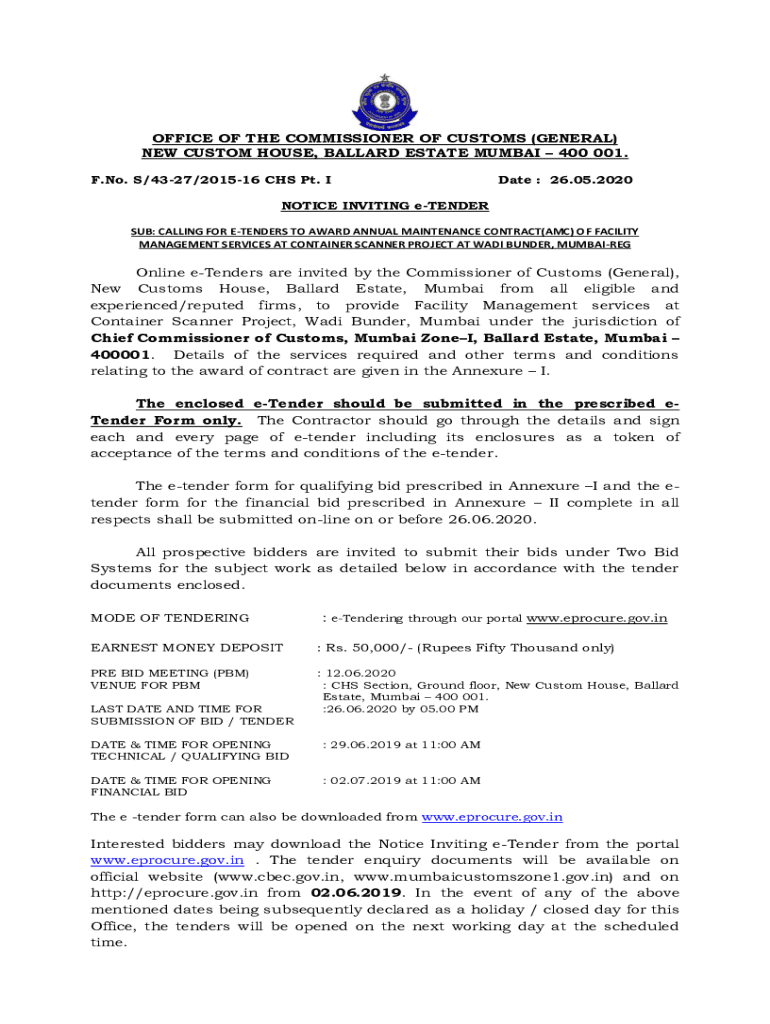 OFFICE OF THE COMMISSIONER OF CUSTOMS (GENERAL) NEW CUSTOM HOUSE, BALLARD ESTATE MUMBAI 400 001. F. No. S/4327/201516 CHS Pt. IDATE : 26.05.2020NOTICE INVITING tender SUB: CALLING FOR TENDERS TO AWARD
