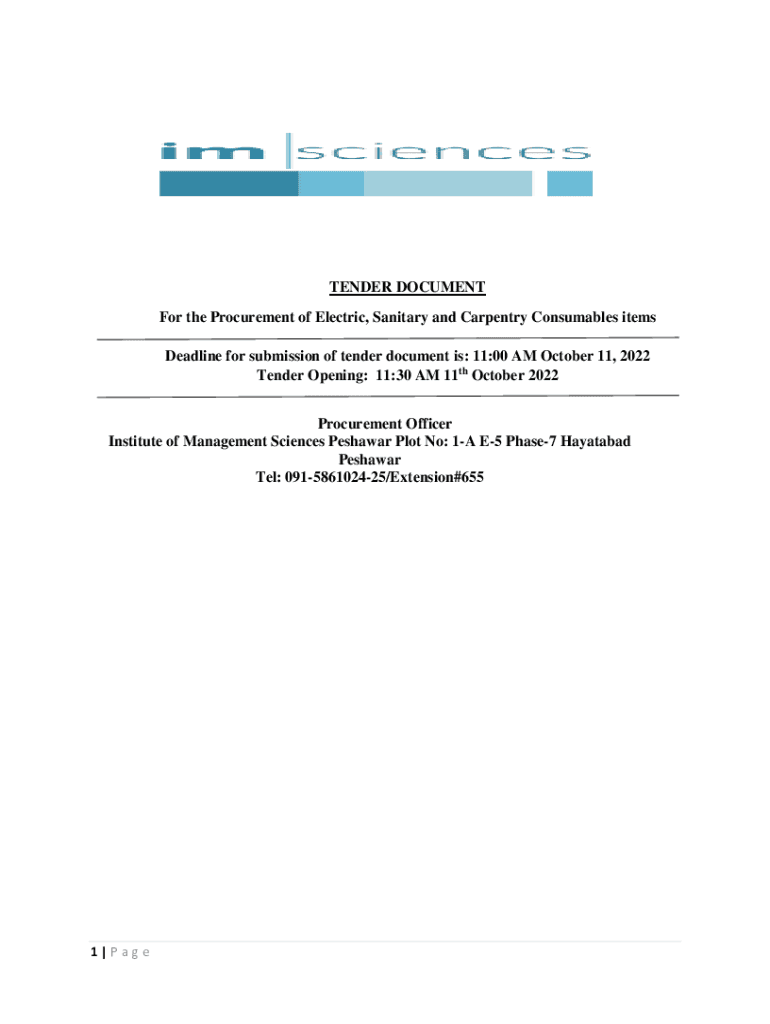 TENDER DOCUMENT For the Procurement of Electric, Sanitary and Carpentry Consumables items Deadline for submission of tender document is: 11:00 AM October 11, 2022, Tender Opening: 11:30 AM 11th October