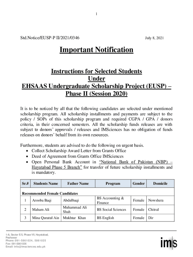 1Std. Notice/EU SPP II/2021/0346July 8, 2021Important Notification Instructions for Selected Students Under EHS AAS Undergraduate Scholarship Project (ESP) Phase II (Session 2020) It is to be noticed