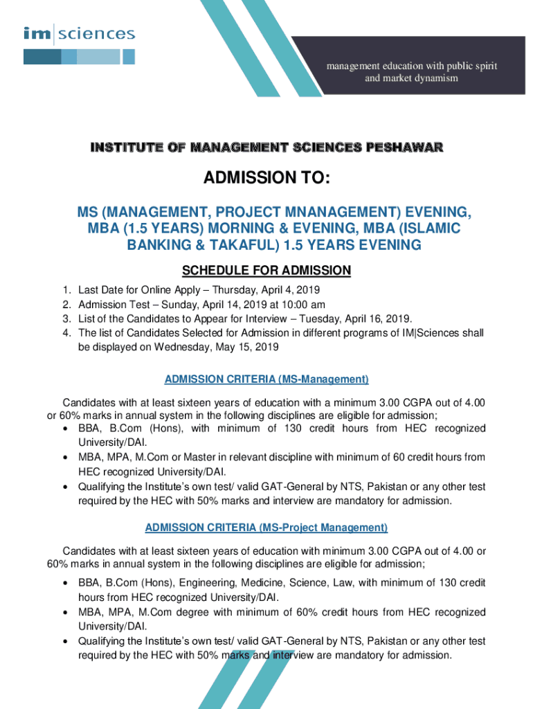 Management education with public spirit and market dynamismINSTITUTE OF MANAGEMENT SCIENCES PESHAWARADMISSION TO: MS (MANAGEMENT, PROJECT MANAGEMENT) EVENING, MBA (1.5 YEARS) MORNING & EVENING, MBA