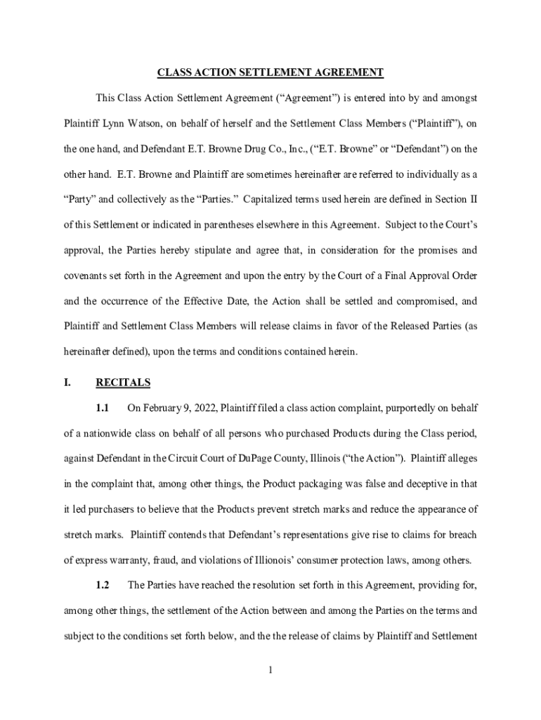 CLASS ACTION SETTLEMENT AGREEMENT This Class Action Settlement Agreement (Agreement) is entered into by and amongst Plaintiff Lynn Watson, on behalf of herself and the Settlement Class Members (Plaintiff),