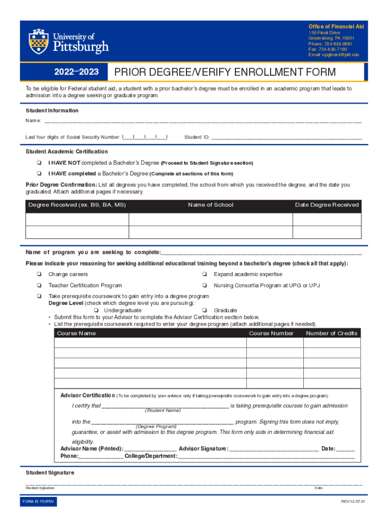 Office of Financial Aid 150 Final Drive Greensburg, PA 15601 Phone: 7248369881 Fax: 7248367160 Email: upgfnaid@pitt.edu20222023PRIOR DEGREE/VERIFY ENROLLMENT Form be eligible for Federal student aid,