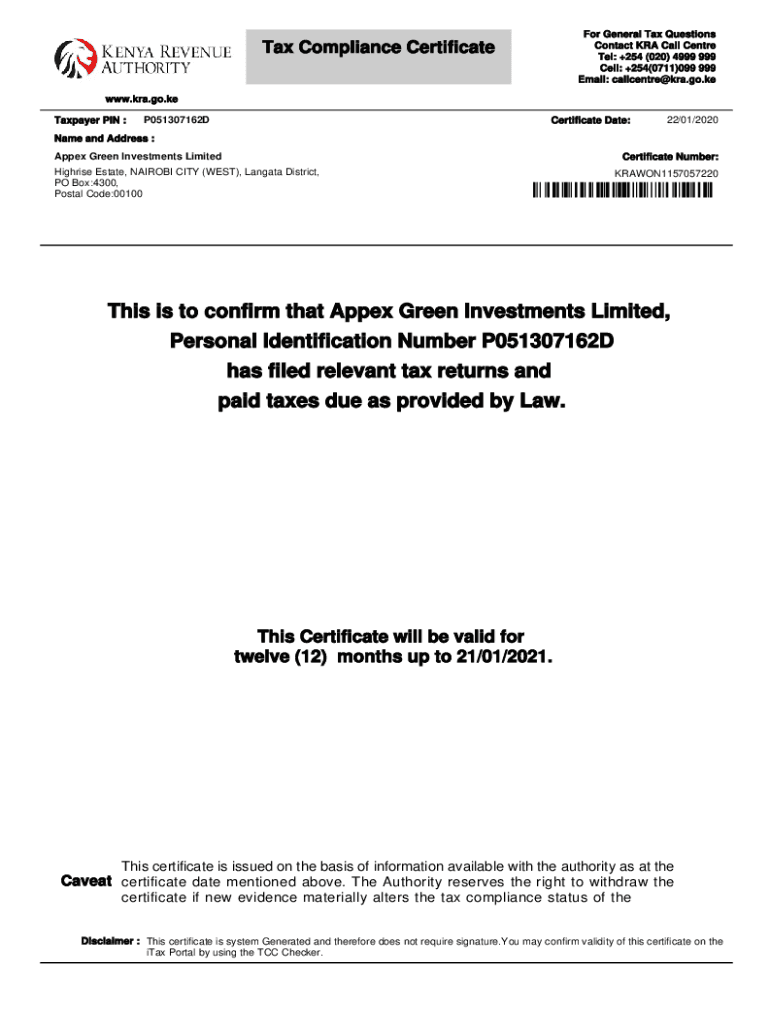 For General Tax Questions Contact ERA Call Center Tel: +254 (020) 4999 999 Cells: +254(0711)099 999 Email: callcentre@kra.go.keTax Compliance Certificate www.kra.go.ke Taxpayer PIN :P051307162DCertificate
