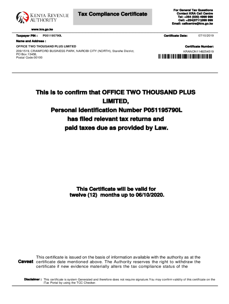 For General Tax Questions Contact ERA Call Center Tel: +254 (020) 4999 999 Cells: +254(0711)099 999 Email: callcentre@kra.go.keTax Compliance Certificate www.kra.go.ke Taxpayer PIN :P051195790LCertificate