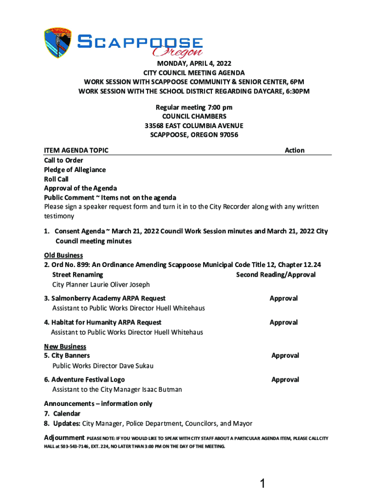 MONDAY, APRIL 4, 2022, CITY COUNCIL MEETING AGENDA WORK SESSION WITH SUPPOSE COMMUNITY & SENIOR CENTER, 6PM WORK SESSION WITH THE SCHOOL DISTRICT REGARDING DAYCARE, 6:30PM Regular meeting 7:00 pm