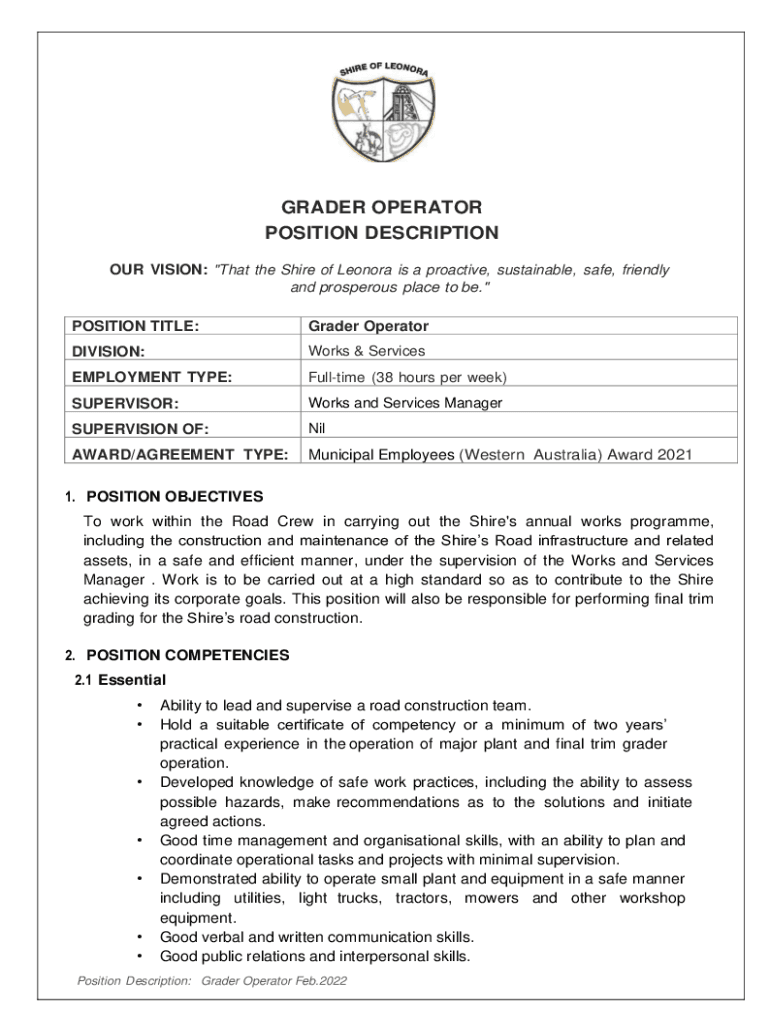POSITION TITLE:Grader OperatorDIVISION:Works