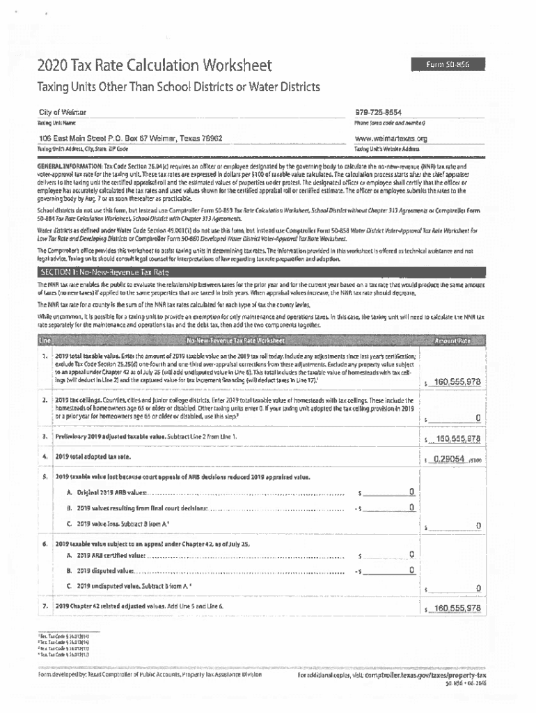 2020 Tax Rate Calculation WorksheetForm 50856Taxing Units Other Than School Districts or Water Districts City of Weimar9797258554Taxing Unit Telephone (area rode106 East Main Street P.O. Box 67 Weimar,
