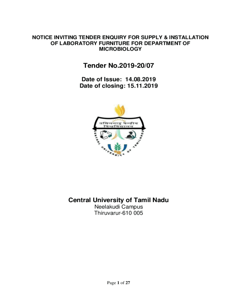 NOTICE INVITING TENDER Inquiry FOR SUPPLY & INSTALLATION OF LABORATORY FURNITURE FOR DEPARTMENT OF MICROBIOLOGYTender No.201920/07 Date of Issue: 14.08.2019 Date of closing: 15.11.2019Central University