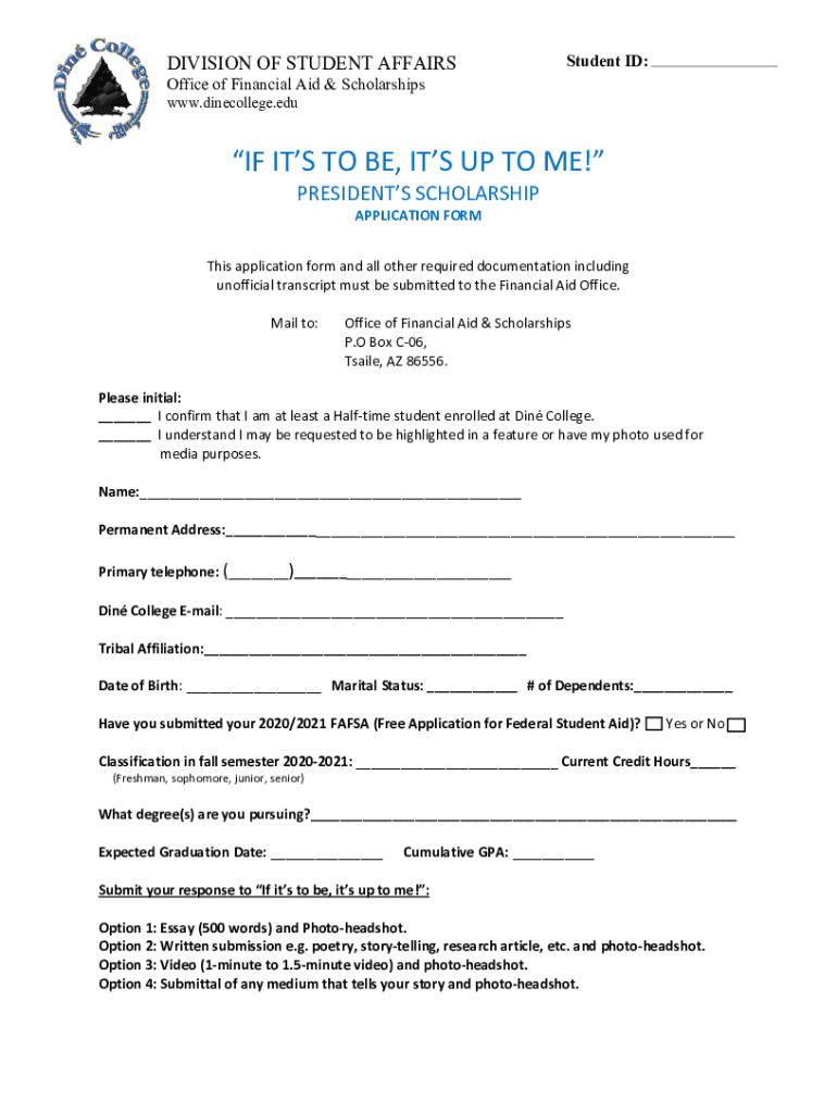 DIVISION OF STUDENT AFFAIRSStudent ID:Office of Financial Aid & Scholarships www.dinecollege.eduIF It's TO BE, It's UP TO ME! PRESIDENTS SCHOLARSHIP APPLICATION Forms application form and all other