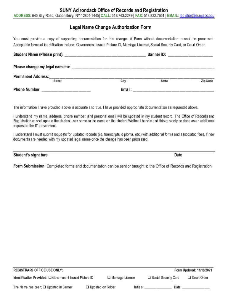 SUN Adirondack Office of Records and Registration ADDRESS: 640 Bay Road, Queensbury, NY 128041445| CALL: 518.743.2279 | FAX: 518.832.7601 | EMAIL: registrar@sunyacc.eduLegal Name Change Authorization
