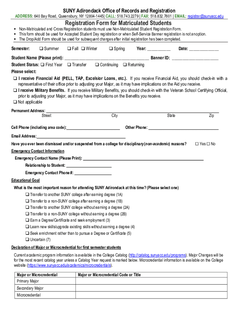 SUN Adirondack Office of Records and Registration ADDRESS: 640 Bay Road, Queensbury, NY 128041445| CALL: 518.743.2279 | FAX: 518.832.7601 | EMAIL: registrar@sunyacc.eduRegistration Form for Matriculated