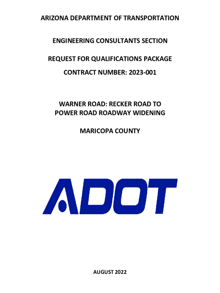 ARIZONA DEPARTMENT OF TRANSPORTATION ENGINEERING CONSULTANTS SECTION REQUEST FOR QUALIFICATIONS PACKAGE CONTRACT NUMBER: 2023001WARNER ROAD: BECKER ROAD TO POWER ROAD ROADWAY WIDENING MARICOPA COUNTYAUGUST