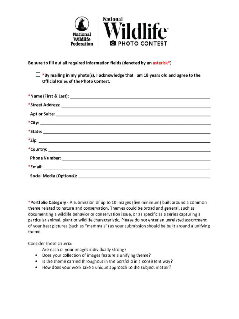 Be sure to fill out all required information fields (denoted by an asterisk*) *By mailing in my photo(s), I acknowledge that I am 18 years old and agree to the Official Rules of the Photo Contest.