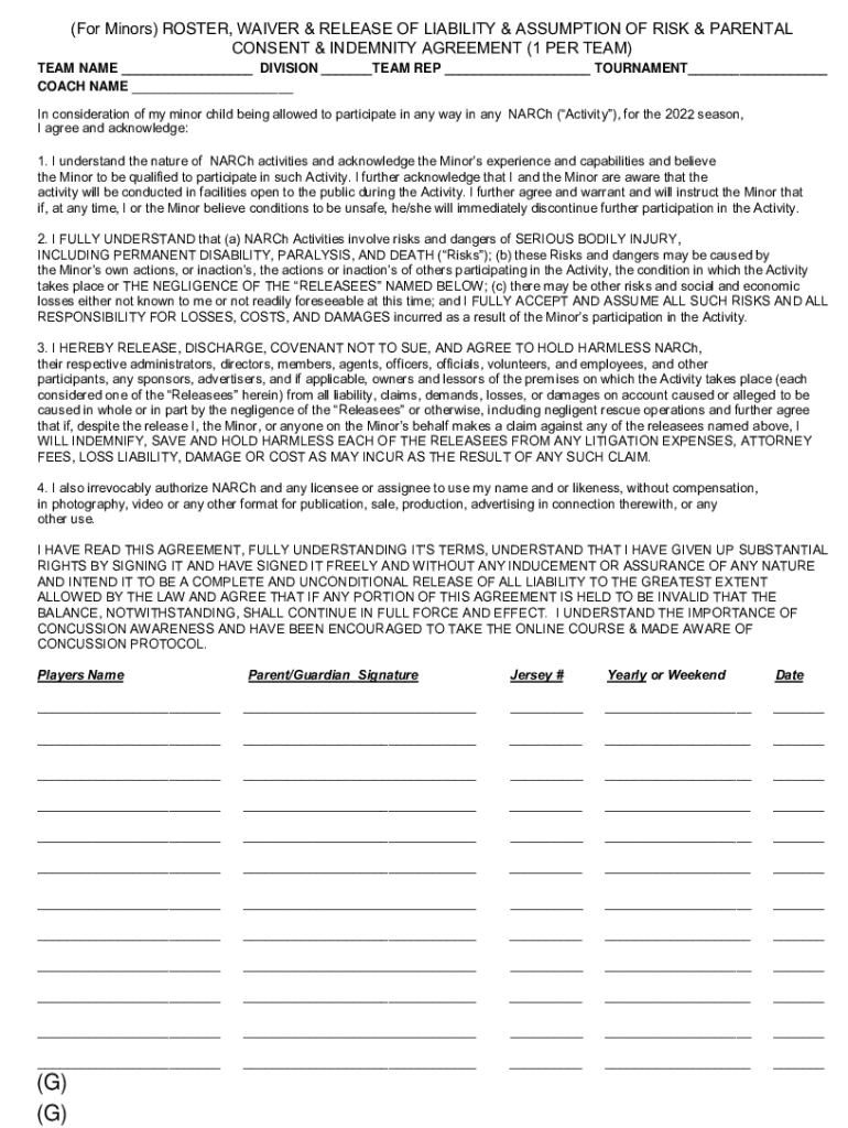 (For Minors) ROSTER, WAIVER & RELEASE OF LIABILITY & ASSUMPTION OF RISK & PARENTAL CONSENT & INDEMNITY AGREEMENT (1 PER TEAM) TEAM NAME ___ DIVISION ___TEAM REP ___ TOURNAMENT___ COACH NAME ___ In