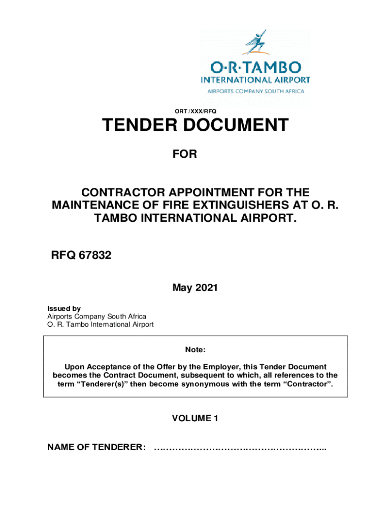 ORT /XXX/TENDER DOCUMENT CONTRACTOR APPOINTMENT FOR THE MAINTENANCE OF FIRE EXTINGUISHERS AT O. R. RAMBO INTERNATIONAL AIRPORT. RFQ 67832 May 2021 Issued by Airports Company South Africa O. R. Rambo