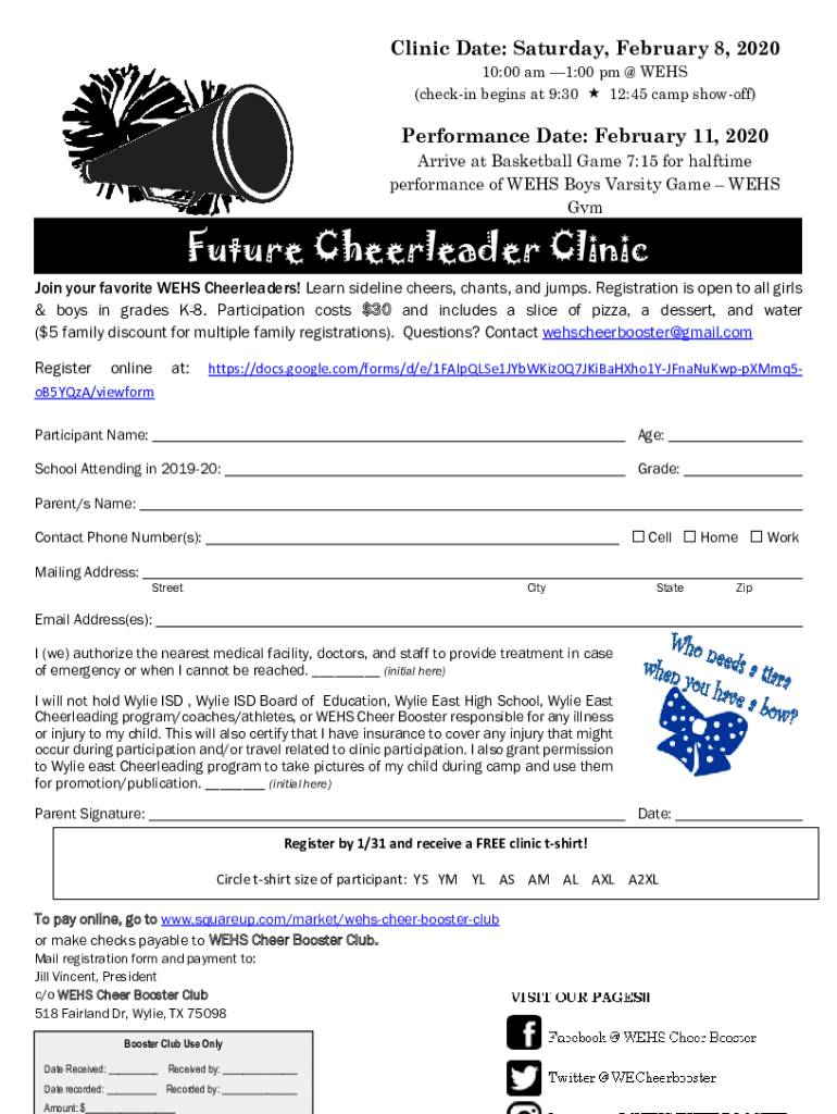 Clinic Date: Saturday, February 8, 2020 10:00 am 1:00 pm @ WEBS (checking begins at 9:30 12:45 camp showoff)Performance Date: February 11, 2020Arrive at Basketball Game 7:15 for halftime performance